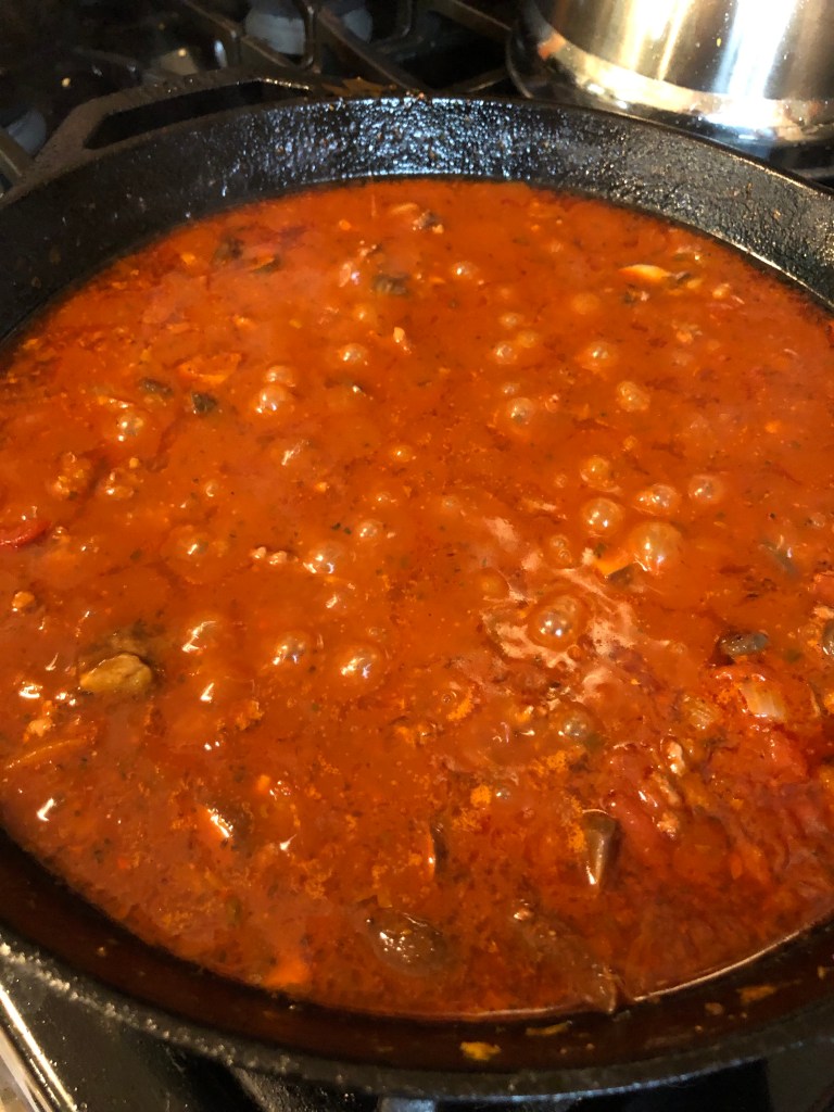 I threw in enough oil to cover the bottom of the pan, tossed in my meats, I waited until all the meat was browned and then I threw in all my veggies at the same time, let it all sweat down, poured in about 1 cup of leftover red wine. Then I added jarred spaghetti sauce or you can add a large can of crushed tomatoes. Now here’s my secret addition to my sauce. I add it to jarred sauce, cans of diced or crushed tomatoes, basically whatever I’m using to build my red sauce. Know one will know its in there but you.