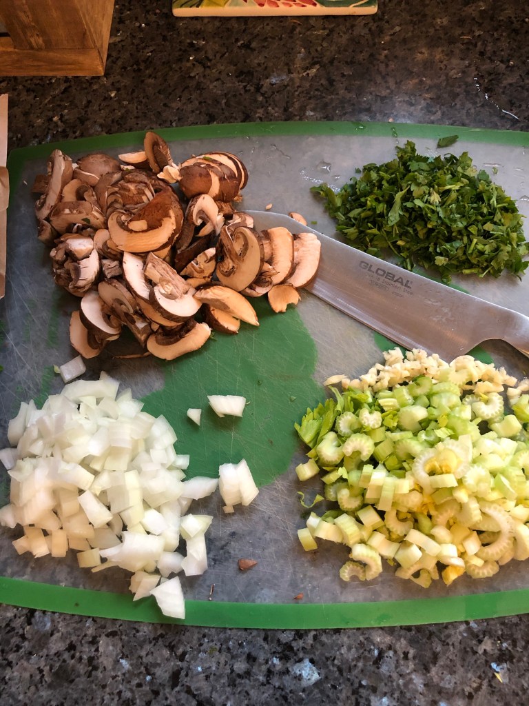 I heated my cast iron pan and at the same time put on a pot of water to boil. From my veggie drawer I used half a tray of cremini mushrooms and a small wilty celery head, I also had a half bunch of parsley. Just a sidebar, I don’t like peppers so those will never be in my fridge but if you love ’em, go for it. I sliced the mushrooms thicker for texture. I did the same with the celery. I like texture in my sauce instead of it all being soft and mushy. If you have peppers just julienne them. They cook pretty quickly and you don’t want them to disappear in the sauce.